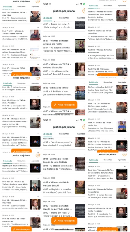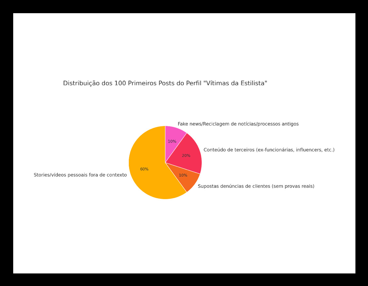 Dos 100 primeiros posts publicados no perfil “Vítimas da Estilista”, aproximadamente 60% são compostos por stories e vídeos meus retirados de contexto. Esses conteúdos incluem lives, desabafos, vídeos antigos e bastidores do meu trabalho, que foram editados e distorcidos para criar uma narrativa negativa. Ou seja, a maior parte do material usado contra mim parte diretamente das minhas próprias redes sociais, sem qualquer ligação com denúncias reais ou reclamações legítimas.