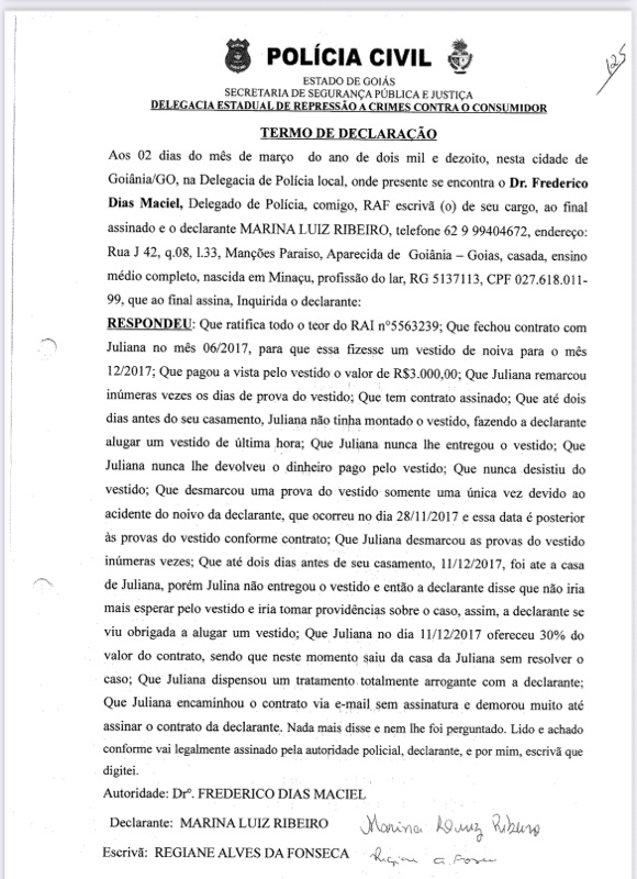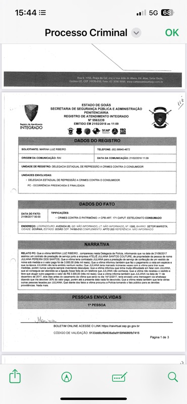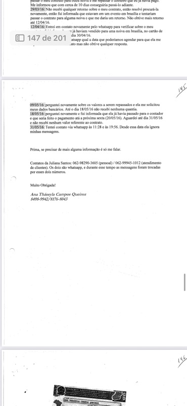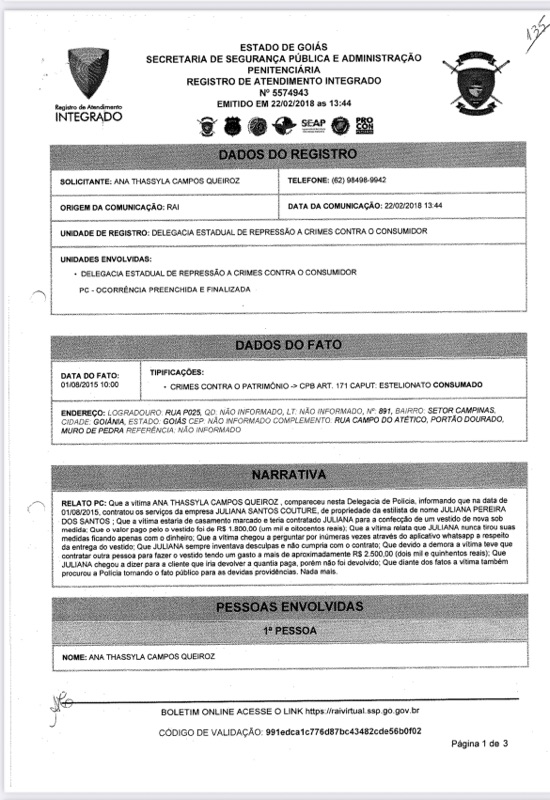 O próximo caso que analiso aqui é o da Ana Thássyla Campos Queiroz. Ela me denunciou à Delegacia de Crimes contra o Consumidor de Goiânia, alegando “estelionato consumado” referente a um contrato de vestido de noiva fechado em agosto de 2015. Segundo o relato dela no boletim, teríamos firmado um contrato no valor de R$ 1.800,00 para confecção sob medida de um vestido de noiva, mas ela alega que nunca teve suas medidas tiradas, que só recebeu desculpas, e que no fim precisou contratar outra costureira e ainda teria tido um prejuízo extra de R$ 2.500,00.
