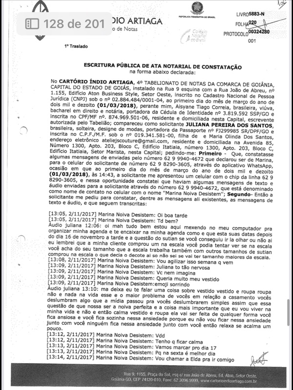 Pouco tempo depois do sorteio, o ateliê mergulhou em uma crise interna: tivemos dois casos graves de sabotagem por funcionárias (que serão detalhados depois) e a rotina saiu completamente do controle. Em meio a isso, minha comunicação com a Nádia foi se perdendo em um vai-e-vem de mensagens, promessas e, honestamente, esquecimento. Só fui lembrar de todo esse episódio meses depois, quando fui notificada pela DECON, em Goiânia, e fiquei sabendo que a Nádia não só se sentiu prejudicada como disse que só decidiu fazer a festa de casamento porque acreditava que teria o vestido de presente, e que, por isso, arcou com uma série de gastos que depois não estavam previstos.