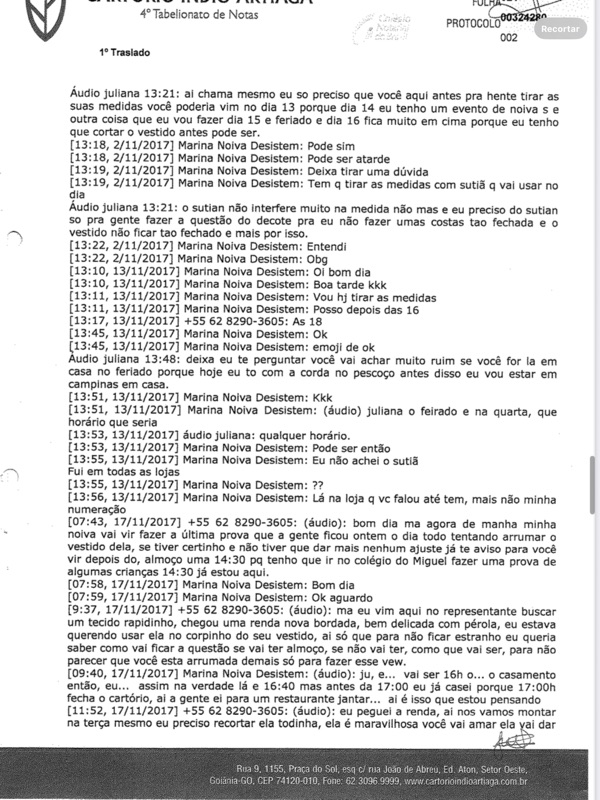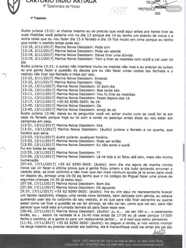 Em nenhum momento há recusa de atendimento, má vontade ou sumiço. Pelo contrário: os registros mostram minha disposição em marcar provas fora do horário comercial, abrir exceções na agenda, ajustar processos diante dos imprevistos pessoais e familiares da própria cliente, e uma paciência quase maternal diante da ansiedade dela. Toda a estrutura do ateliê, pequeno e artesanal, foi mobilizada para tentar garantir que Marina realizasse o sonho do vestido de noiva.