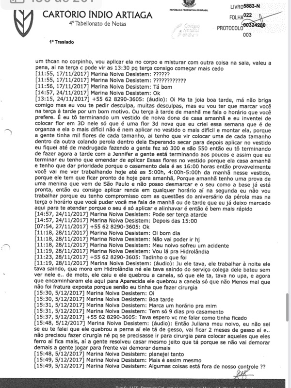 Depois disso, Marina some. Nunca buscou reembolso judicialmente, nunca mais entrou em contato. Só ressurgiu meses depois, motivada por reportagens e denúncias de outras pessoas, para dar um depoimento na delegacia — que, aliás, não apresentou provas nem diálogo real, como foi demonstrado na ata notarial completa das nossas conversas.