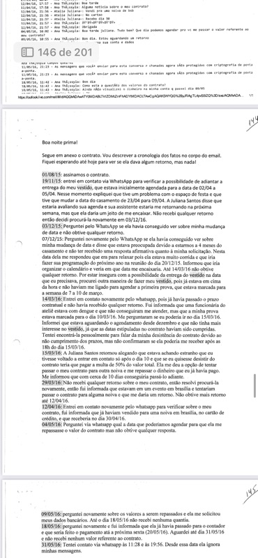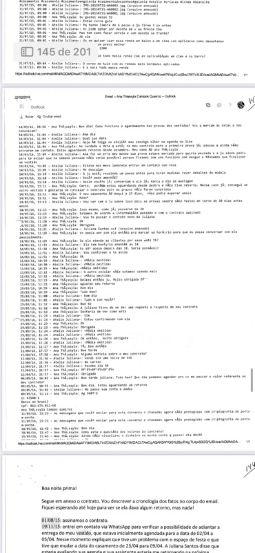 Além disso, é possível verificar nas conversas por email — que ela mesma anexou ao processo — que houve troca de mensagens, envio de orçamento, confirmação do modelo e, inclusive, marcação de horários para atendimento e retirada de medidas. Não existe nenhum registro de reclamação formal, negativa de atendimento ou pedido oficial de reembolso antes da denúncia. Muito menos qualquer tentativa de acordo extrajudicial ou de reaproveitamento do vestido, como prevê o próprio contrato.