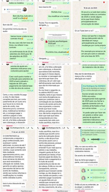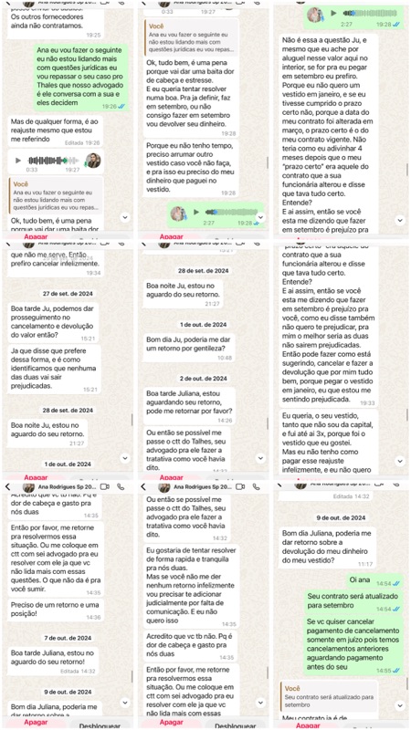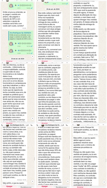 Ao revisar contratos, Juliana identificou o erro, explicou a necessidade de reajuste de 30%ou, alternativamente, ofereceu entregar o vestido já em janeiro/2025, sem custo extra,