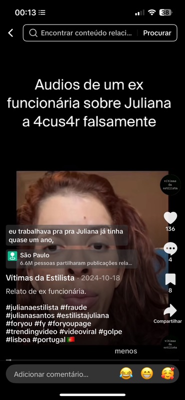 O vídeo mostra Eliane repetindo, de forma quase ensaiada, o mesmo relato que já usou em delegacia e em matérias da imprensa sensacionalista: diz que trabalhou comigo por quase um ano, que foi coagida, que presenciou sabotagem, que saiu traumatizada e nunca mais conseguiu costurar. Não apresenta qualquer prova objetiva, apenas sua narrativa cheia de distorções e omissões convenientes. O post não gerou muitos comentários, mas a legenda traz hashtags difamatórias (#fraude, #golpe, #julianaestilista), incitando a associação do meu nome a crimes — tudo sem qualquer fundamento.
