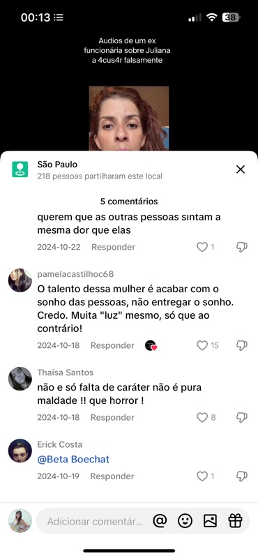 - Erick Costa: Marcação de outra pessoa (@Beta Boechat), incentivando compartilhamento e viralização do conteúdo difamatório.