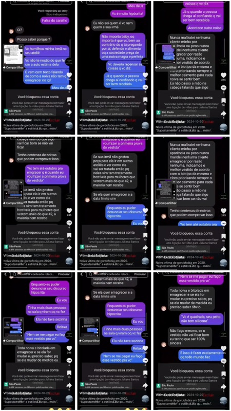 Pouco depois, postei nos stories uma reflexão sobre a pressão que a sociedade impõe às noivas para emagrecerem para o casamento. Não citei nomes, não expus ninguém. A irmã da noiva, que nunca esteve no ateliê, começou a me atacar respondendo os stories com xingamentos (“hipócrita”, etc) — e está tudo registrado nos prints.