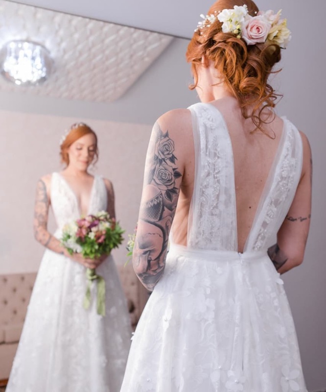 Apesar das explicações, a noiva insistiu muito para experimentar esse vestido. O mostruário disponível era tamanho P, impossível de servir nela. Para evitar que ela se sentisse constrangida ou humilhada, disse que o vestido não estava ali, que estava na lavanderia — um cuidado para não expô-la a um constrangimento desnecessário. Ao invés disso, ofereci para ela experimentar um modelo com corset, que daria o caimento, sustentação e modelagem que ela buscava (ela mesma expressou o desejo de “emagrecer para o casamento”, mas expliquei que com o corset isso nem seria necessário).