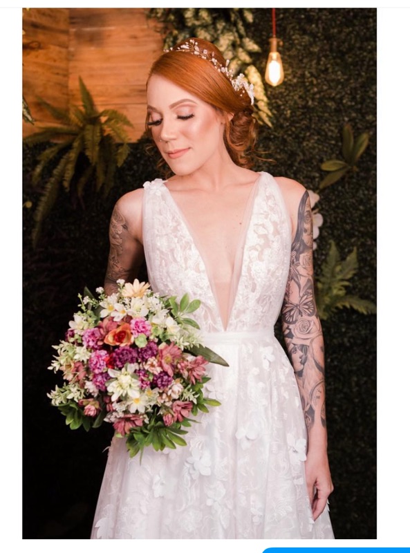 A noiva em questão não era gorda — era uma mulher padrão, que hoje seria classificada como “medisize”, provavelmente vestindo entre 42 e 44, com bastante busto. Ela demonstrou interesse por um modelo específico, o “Modelo Fada”, criado originalmente para outra noiva (Bruna). Esse modelo, por ter decote profundo na frente, lateral e costas, simplesmente não serve para todos os biotipos, especialmente para quem tem muito busto, já que não oferece sustentação adequada, aqui o modelo bruna :