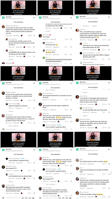 - Generalização e mentira coletiva: A página reforça que “todas as clientes passaram pelo mesmo”, cria um histórico falso de supostas vítimas e estimula seguidores a compartilhar mais histórias negativas (muitas claramente inventadas).