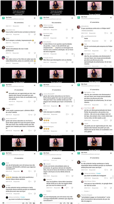 O post analisado, publicado e amplificado pela página “Vítimas da Estilista”, reúne 156 comentários de conteúdo majoritariamente ofensivo, difamatório e humilhante, dirigidos contra minha pessoa, minha carreira e minha integridade.