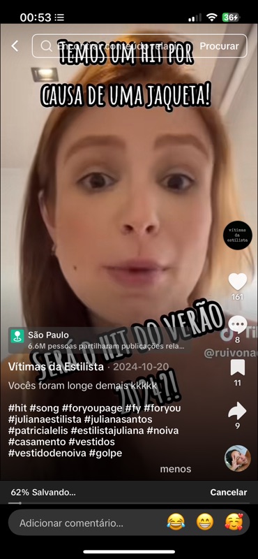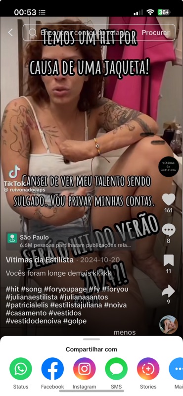 As legendas (“temos um hit por causa de uma jaqueta!” e “será o hit do verão 2024?!”) deixam explícito o escárnio: todo o conflito, que envolve acusações sérias, processos e exposição, é reduzido a uma piada, um “hit” de TikTok, como se fosse algo trivial ou divertido. Esse tipo de abordagem transforma o sofrimento alheio em meme coletivo, incentivando o público a participar dessa onda de deboche.