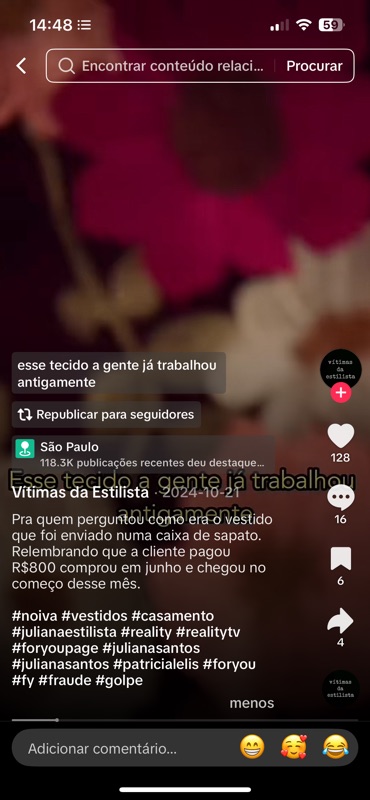 O vídeo foi publicado com legenda sensacionalista, claramente direcionada para instigar comentários negativos sobre o vestido floral criado para o projeto “Noivas Cegas”. A peça foi posteriormente colocada à venda e comprada por uma cliente vereadora, que também foi alvo de difamação ao ter seu vídeo de unboxing exposto na mesma página. O intuito aqui é desqualificar a peça e, por tabela, a estilista, criando espaço para linchamento virtual e ataques à estética e originalidade do trabalho.