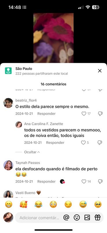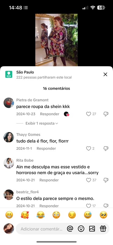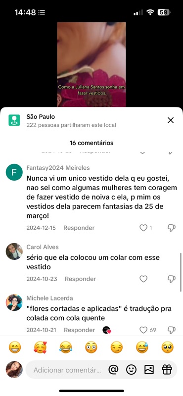 - Bullying estético e profissional: Comentários repetitivos sobre aparência, gosto pessoal e técnica, incentivados pelo próprio perfil (“pesquisa vestido fubango shein”), configuram perseguição e injúria coletiva.