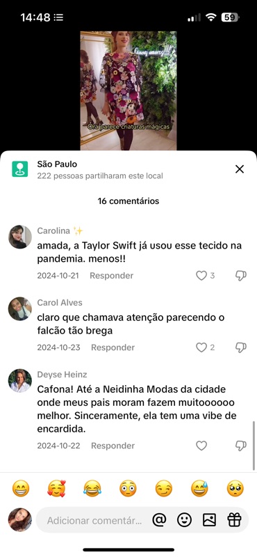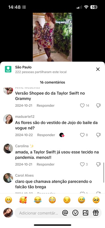 - Desqualificação da originalidade: insinuações de cópia barata (“versão Shopee”, “parece roupa da Shein”, “Taylor Swift já usou”, etc.)