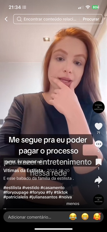 - ✅ Conteúdo fora do escopo: O vídeo trata da rivalidade entre Patrícia e Janaina Stoleto — duas pessoas que têm desavenças antigas. Apesar disso, o vídeo é publicado no perfil “Vítimas da Estilista”, supostamente criado para relatar casos de noivas lesadas por Juliana Santos.