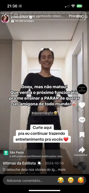 Mais uma vez, a página utiliza um conteúdo retirado diretamente dos meus stories no Instagram — dessa vez, um meme irônico que repostei por sugestão de uma seguidora que compreendia o que eu estava passando. O vídeo, fora de qualquer contexto, foi usado com o único intuito de reforçar a narrativa debochada da página.