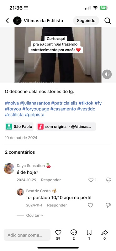 Esse conteúdo foi compartilhado por mim em tom de humor, como forma de desabafar diante de mais uma decepção interna no ateliê. Em nenhum momento ele teve relação com as acusações levantadas pela página.