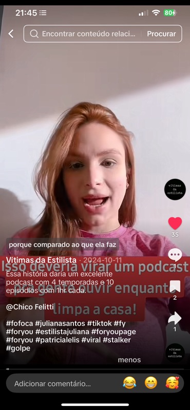 Um dos vídeos chega a marcar o jornalista e escritor Chico Felitti, sugerindo que a “história da Janaína” daria um ótimo podcast de crime. Essa tentativa de envolver um profissional respeitado que investiga crimes reais é mais uma estratégia de manipulação, tentando legitimar uma narrativa que, na verdade, serve apenas como espetáculo difamatório.