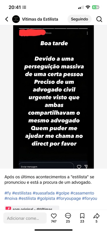 onde ela relata estar sofrendo perseguição massiva por parte de uma pessoa (no caso,