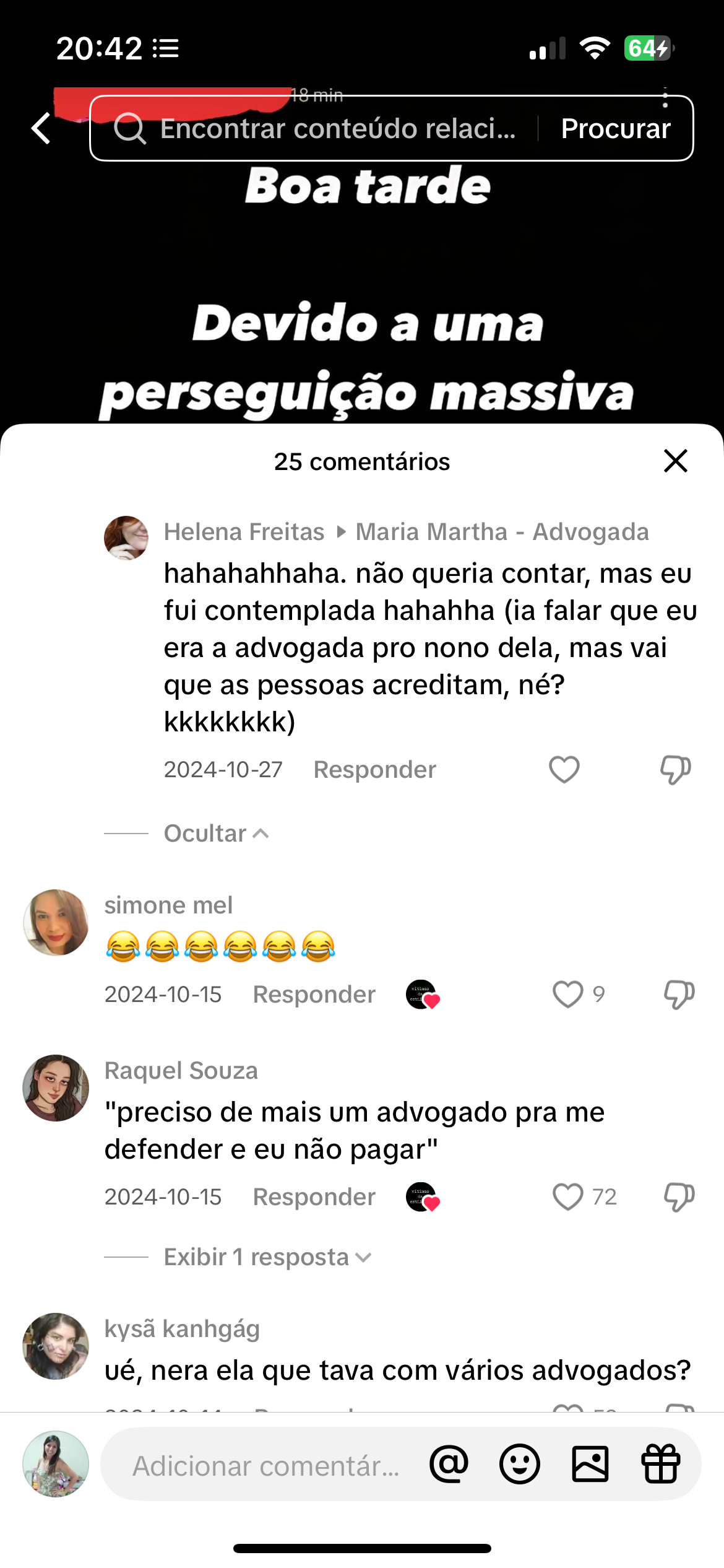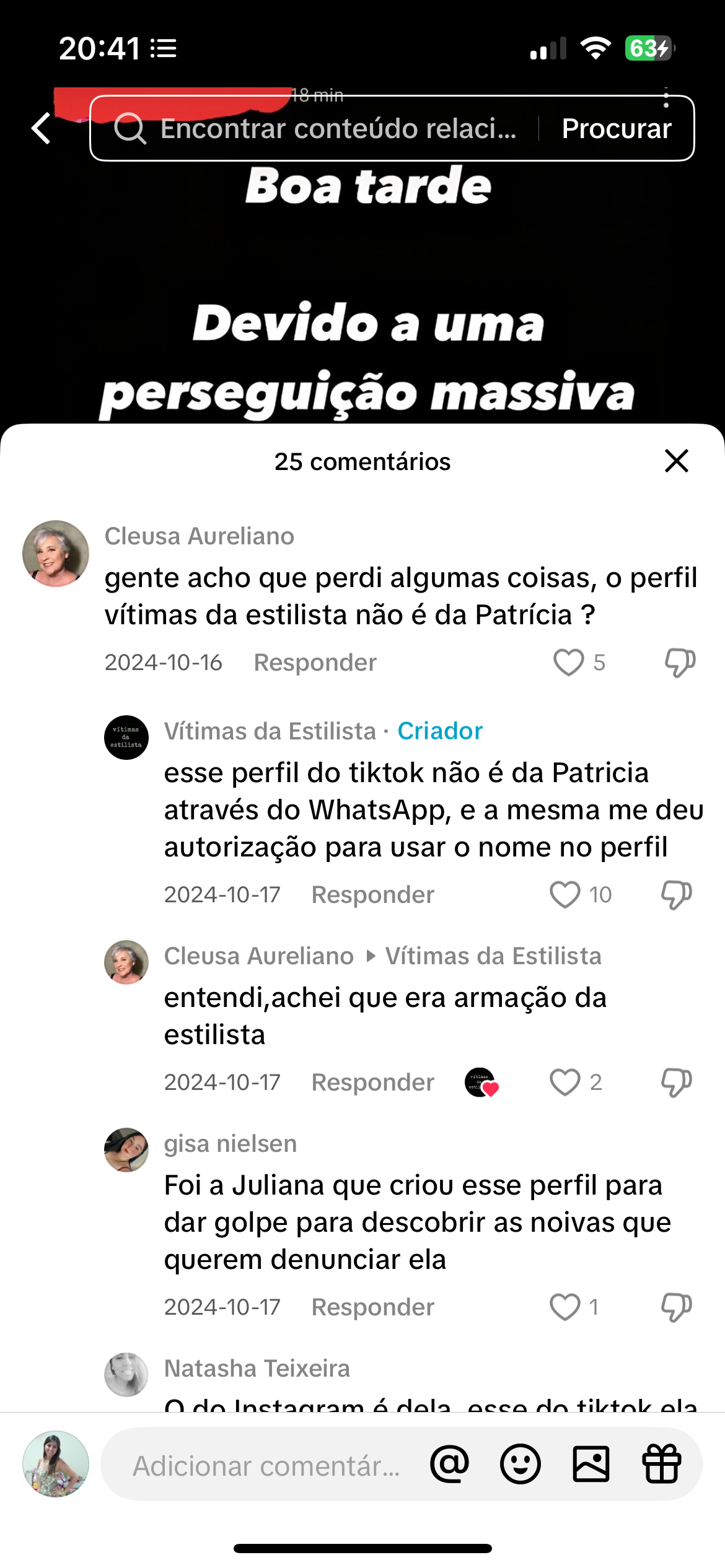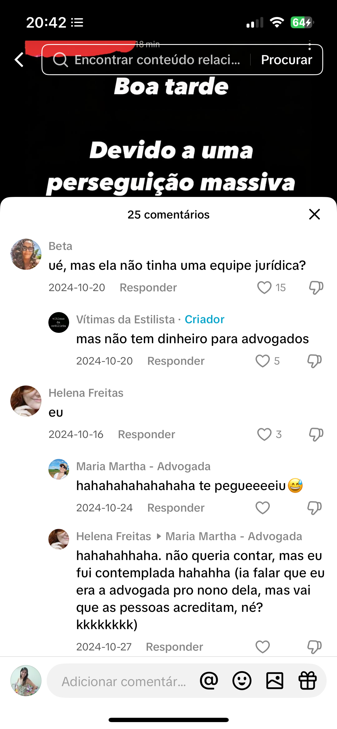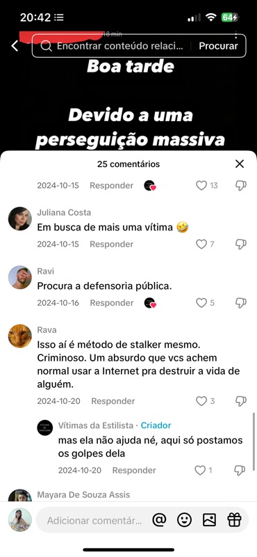 denunciar ela.”13. “O do Instagram é dela, esse do TikTok ela respondeu o comentário em algum vídeo que