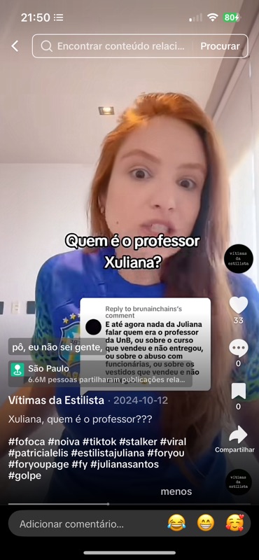 Mais um repost do perfil “Vítimas da Estilista” de um vídeo originalmente publicado por Patrícia. Neste vídeo, ela se refere a uma fala minha sobre um comentário que li no grupo do Telegram — onde circulavam relatos sérios e denúncias sobre ela, muitos anônimos. Um deles mencionava um suposto professor da UnB que teria tirado a própria vida após episódios envolvendo Patrícia. Não se sabe ao certo se o relato é verídico, mas o comentário estava lá, e foi isso que eu mencionei, de forma pontual, em um vídeo.