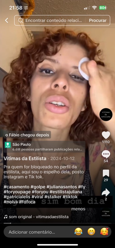 Mais uma vez, a página “Vítimas da Estilista” resgata um story absolutamente comum e inofensivo: o dia 12 de outubro, quando fui vestir uma das minhas noivas queridas. O vídeo mostra eu me arrumando — maquiagem leve, clima de festa — e, na sequência, vários momentos dentro do evento: a casa linda em São Paulo onde aconteceu o casamento, eu com o Fábio, a cerimônia, o almoço, os bastidores.