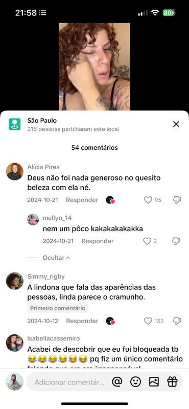 Diversos comentários são voltados unicamente para me ofender enquanto pessoa, sem qualquer vínculo com o conteúdo do vídeo ou com crítica legítima. Exemplos como: