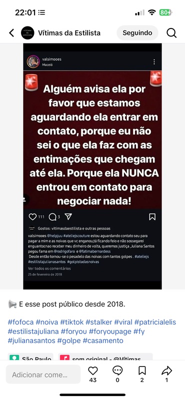O conteúdo desse post traz um print de uma publicação feita por Val Simões, uma cliente que contratou meus serviços em 2016 e que, desde então, iniciou uma longa trajetória de perseguição e difamação pública contra mim. Essa imagem foi retirada diretamente de seu Instagram pessoal e republicada no perfil “Vítimas da Estilista” em fevereiro de 2018, marcando o que pode ser considerado um dos primeiros registros de ataque público contra minha imagem profissional.