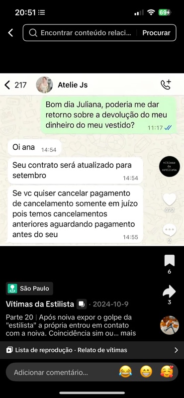 O vídeo expõe um print da conversa de WhatsApp entre a cliente Ana Rodrigues e a estilista