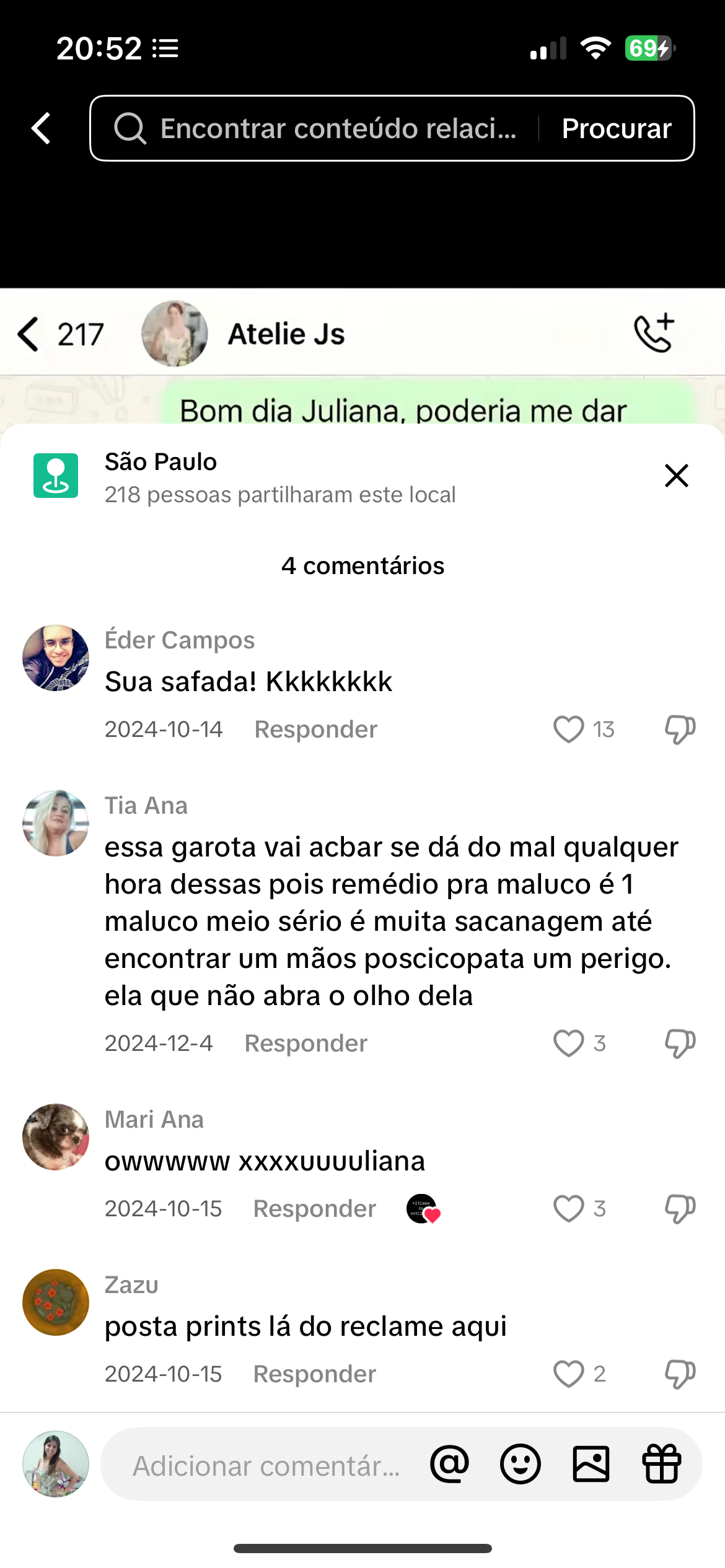 indevida e do ataque coletivo à estilista Juliana, utilizando um print de conversa para