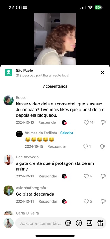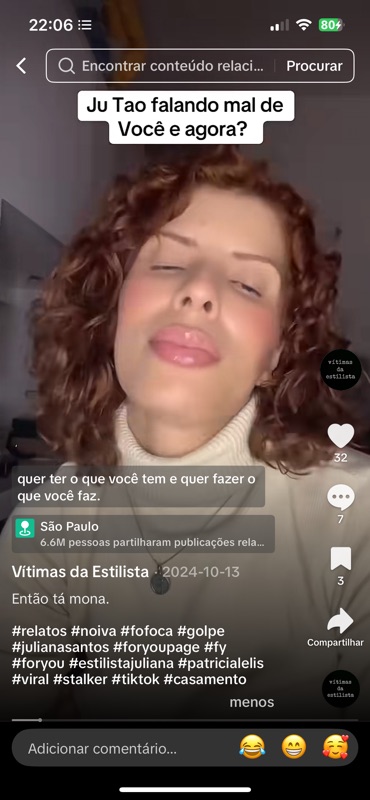 Mais uma vez, o perfil Vítimas da Estilista recorre a um vídeo recente meu — um daqueles que publiquei tentando reagir aos ataques com leveza. Na época, usei um áudio de superação que estava em alta no TikTok. Um vídeo simples, onde apareço confiante, tranquila, sem citar nomes, apenas vivendo minha vida e tentando não me deixar abalar.