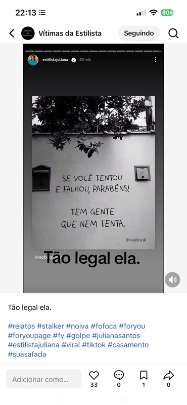 O perfil “Vítimas da Estilista” repostou esse conteúdo sem autorização, adicionando por cima a legenda sarcástica “Tão legal ela.”, acompanhada de hashtags depreciativas como #golpe, #julianasantos, #suasafada e #stalker, que não têm qualquer relação com o conteúdo publicado originalmente por Juliana. O objetivo evidente é fomentar o escárnio, alimentar o ódio e sustentar a narrativa de difamação em curso.