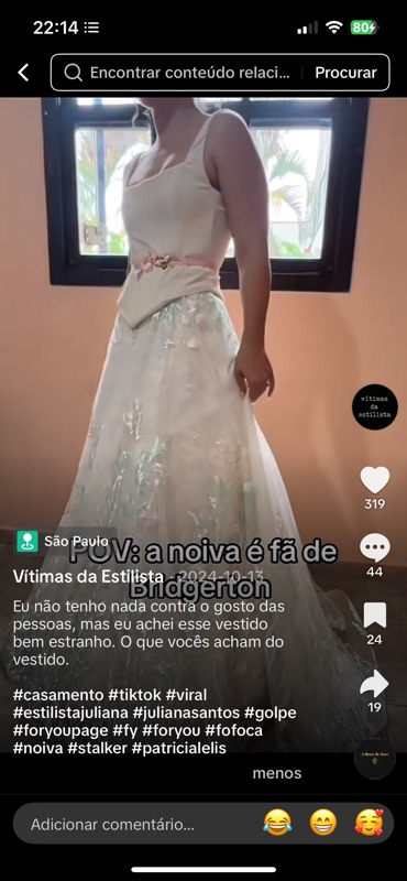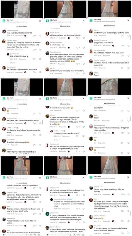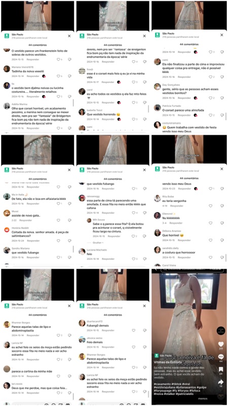 Esse tipo de comentário é o que a página costuma usar para alimentar o tribunal do TikTok. Não há denúncia, não há reclamação da cliente, não há nenhuma infração técnica apontada — apenas uma tentativa de ridicularizar a estética do vestido e, consequentemente, o meu trabalho como estilista. O uso da hashtag #golpe e da minha identidade profissional junto de termos como “#stalker” e “#patricialelis” mostra a clara intenção de associar minha marca a crimes e escândalos mesmo quando o post sequer tem qualquer relação com problema real.