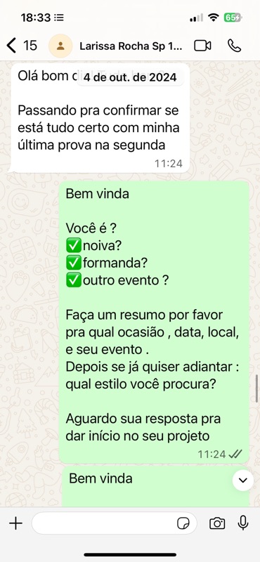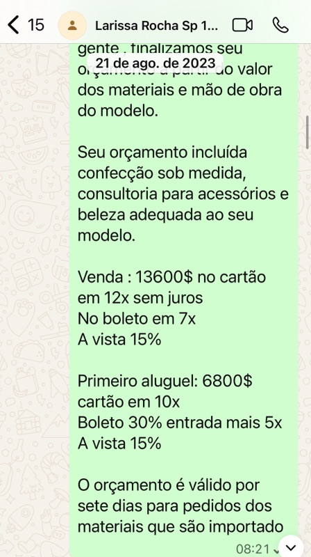 No dia 9 de outubro, Larissa retirou o vestido sem assinar o termo de recebimento. Saiu do ateliê com pressa e não retornou. No dia 14, como de costume, enviei a mensagem padrão com as instruções de devolução do vestido e da anágua — que deveria acontecer até dia 19. Ela nunca respondeu.