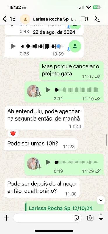 Em junho de 2024, no auge dos ataques contra mim nas redes, Larissa entrou em contato afirmando que desejava cancelar o contrato. Disse estar com medo por causa das “fofocas” e exposições. Eu expliquei que, naquele momento, com tantos cancelamentos simultâneos e dificuldades financeiras, não poderia garantir uma devolução imediata do valor pago.