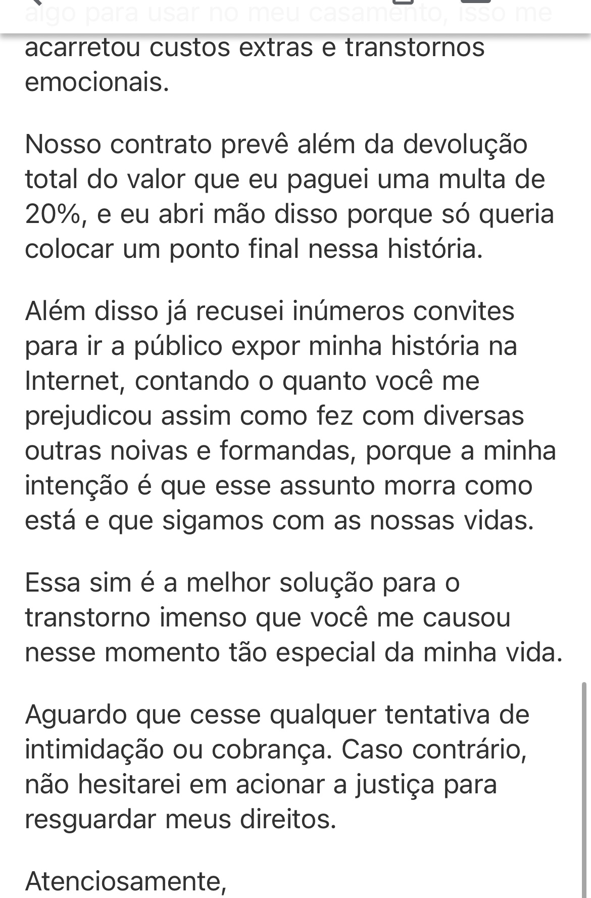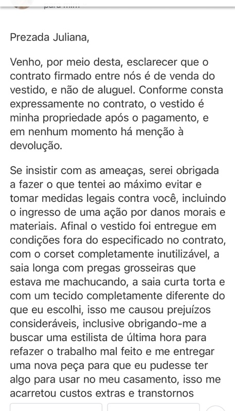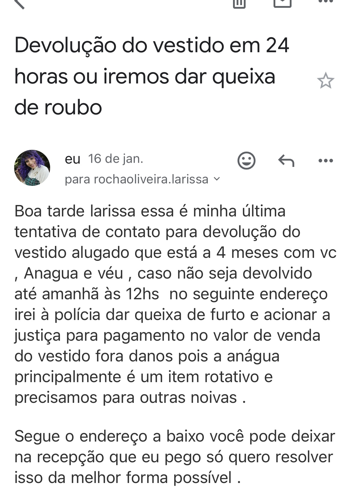 No dia 16 de janeiro de 2025, quatro meses após a retirada do vestido e sem qualquer devolução — nem do corset, nem da saia, nem da anágua — Juliana enviou um último e-mail formal à noiva Larissa Rocha, com o seguinte conteúdo: