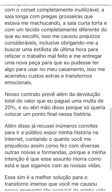 Mais do que isso, usou a insegurança gerada pelas perseguições que eu sofria nas redes para me coagir, insinuando que poderia se juntar às páginas que me atacavam caso eu insistisse em buscar meus direitos. Ela não só se apropriou indevidamente de um vestido e uma anágua — ela tentou me silenciar com medo.