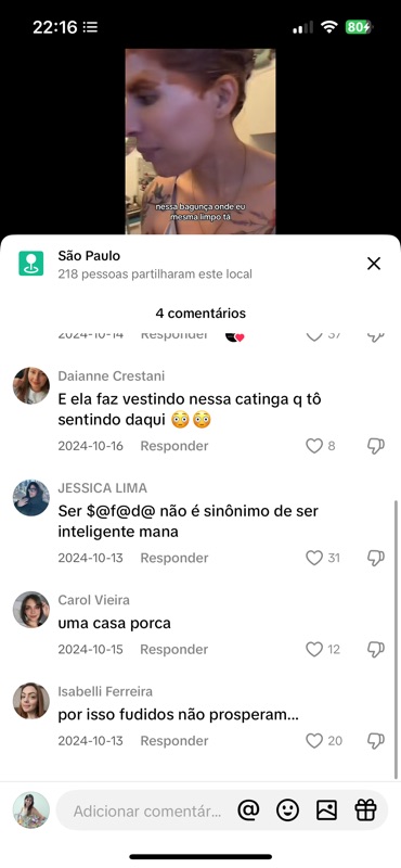 ➡️ Um comentário com tom escatológico, apelando para um imaginário de sujeira que sequer é visível no vídeo. Essa frase não é só ofensiva — é humilhante, nojenta e desumana. Esse tipo de ataque usa a suposição de um “mau cheiro” para desqualificar uma mulher que trabalha de casa. É violência simbólica disfarçada de piada.