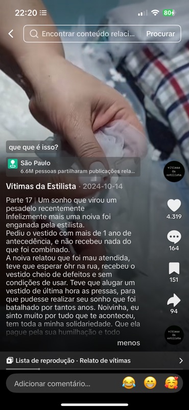 No dia 14 de outubro de 2024, a página “Vítimas da Estilista” publicou o vídeo identificado como Parte 17, onde uma mão aparece manuseando um vestido de noiva e, ao fundo, a legenda apresenta um relato falso e altamente difamatório.