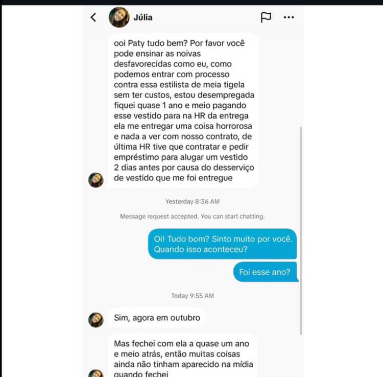 Surpreendentemente, dias depois do casamento, fui alertada por seguidores sobre um vídeo publicado na página “Vítimas da Estilista”, onde Júlia (ou sua mãe) apresentava uma versão completamente distorcida dos fatos. Entre as acusações, estavam alegações de entrega de vestido diferente do contratado, uso de flores “retiradas de outros vestidos” e até aplicação de cola de má qualidade. Tudo isso, além de ser falso, ignora as conversas e acordos feitos durante o processo, além do consentimento explícito dado pela própria cliente nas adaptações realizadas.