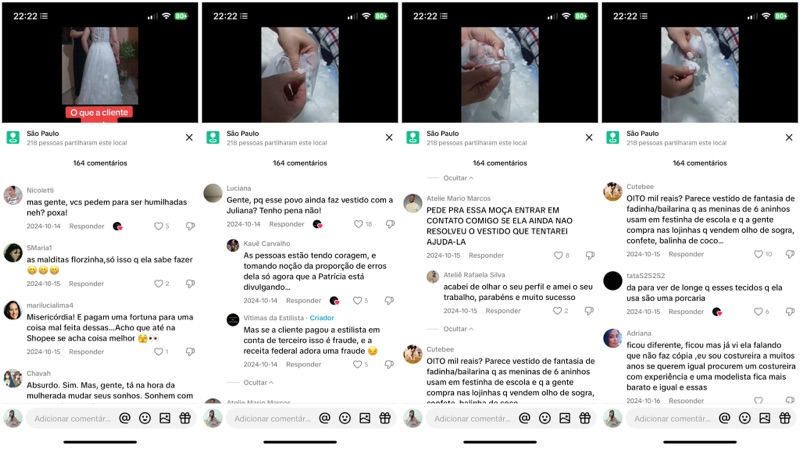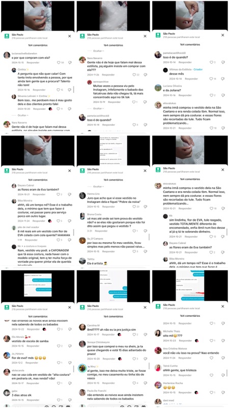Comentários como “isso aí não é prova de vestido não” ou “isso é renda colada” espalham desinformação sobre processos legítimos da costura artesanal, confundindo o público e promovendo julgamento baseado em suposições. A página “Vítimas da Estilista” reforça essas falas ao curtir ou responder apenas quando há deboche envolvido, e nunca quando há tentativa de esclarecimento.