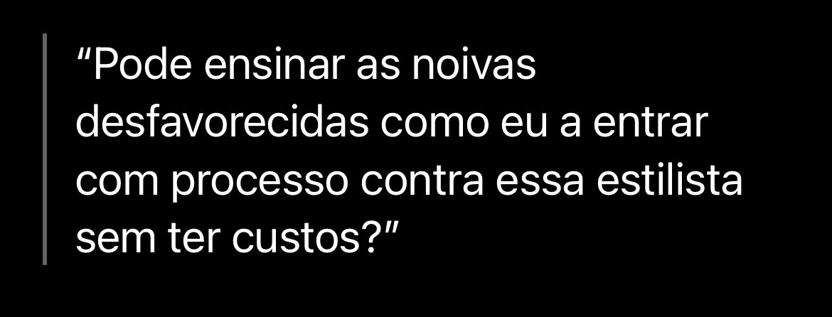 Na mensagem, a cliente não busca diálogo, solução ou ressarcimento. Em vez disso, já inicia o contato pedindo “orientações sobre como processar a estilista sem custos”, utilizando expressões como “estilista de meia tigela” e acusando um suposto “deserviço”. A fala é carregada de adjetivos pejorativos, inconsistências e termos jurídicos incomuns para um relato espontâneo — o que já levanta suspeitas sobre a autenticidade e motivação da mensagem.