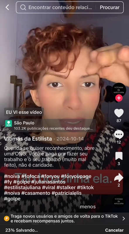 Neste post, mais uma vez, vemos um vídeo meu sendo retirado do contexto e repostado pela página “Vítimas da Estilista”, com o objetivo claro de desmoralizar qualquer mensagem que eu compartilhe e abrir espaço para mais uma rodada de ataques nos comentários.