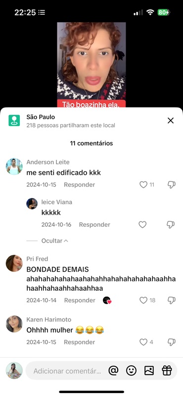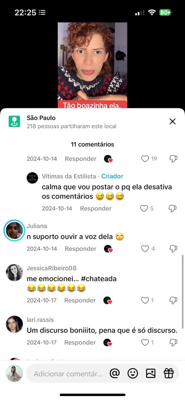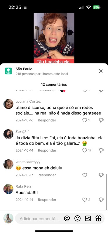 - “Calma que vou postar o porquê ela desativa os comentários 😅😅😅” – Comentário feito pelo próprio perfil da página, com tom debochado e provocativo, sugerindo que a criadora do vídeo não tolera críticas, quando na verdade, o ambiente criado pela própria página é hostil e abusivo.