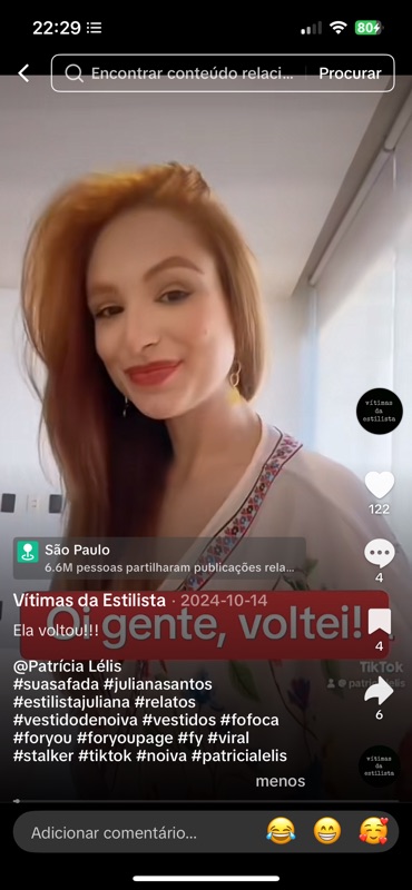 No dia 14 de outubro de 2024, o perfil Vítimas da Estilista publica mais um vídeo — desta vez com um tom de “grande retorno”. A legenda “Ela voltou!!!” anuncia o reaparecimento de Patrícia Lélis, uma das figuras mais polêmicas e contraditórias desse caso.