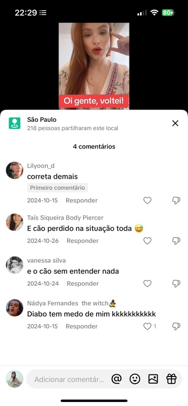 Nos comentários, observamos um padrão curioso: sem nenhuma relação direta com fatos ou com o tema da postagem, os seguidores recorrem a frases genéricas, debochadas ou vazias. Comentários como “correta demais”, “o cão perdido na situação toda”, e “diabo tem medo de mim” revelam o tom superficial e teatral que a página passou a adotar. Não há diálogo. Não há prova. Apenas espetáculo e adoração cega.