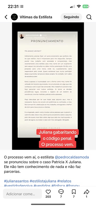 O vídeo publicado no perfil “Vítimas da Estilista” mostra uma nota oficial postada por Pedro Caldas em outubro de 2024, onde ele alega que seu nome foi utilizado sem autorização em um orçamento enviado a uma noiva, no qual supostamente faria o corset. Ele afirma que não sabia do projeto e que tomaria medidas legais, mesmo sem procurar esclarecimento direto.