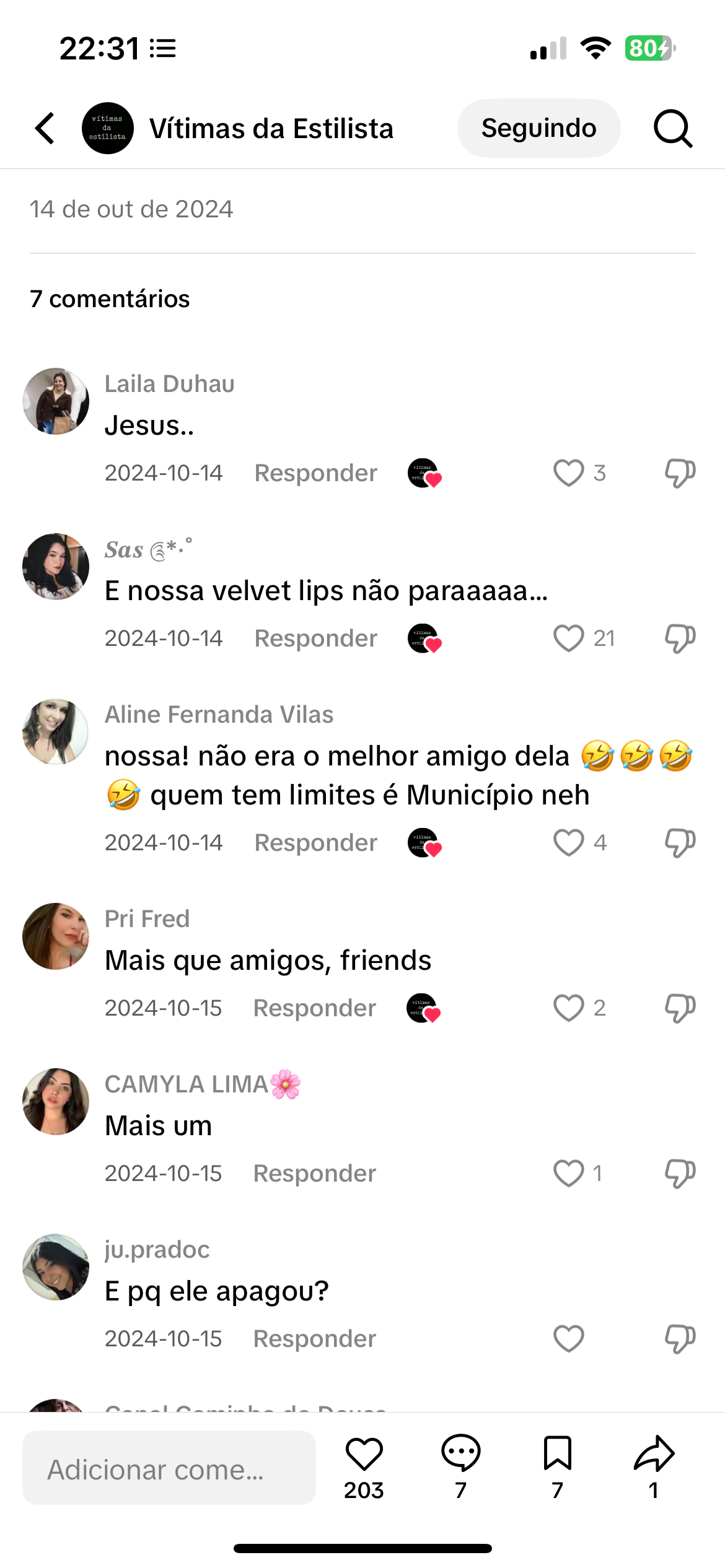 📌 Observação: O perfil “Vítimas da Estilista” curtiu quase todos os comentários, validando humilhações, ironias e deboches, o que configura incentivo à zombaria pública e perseguição moral.