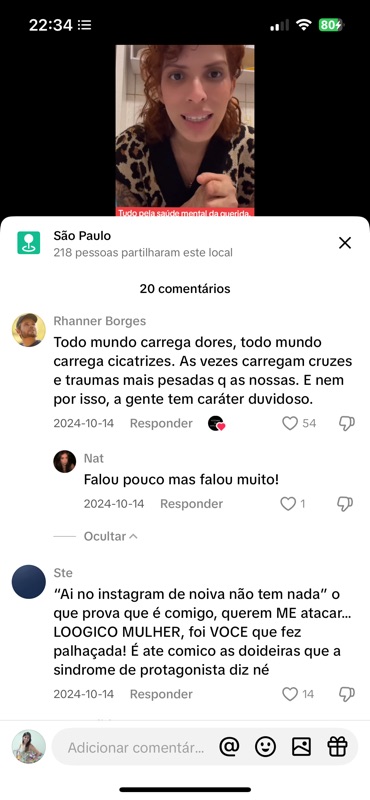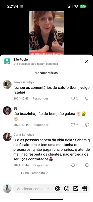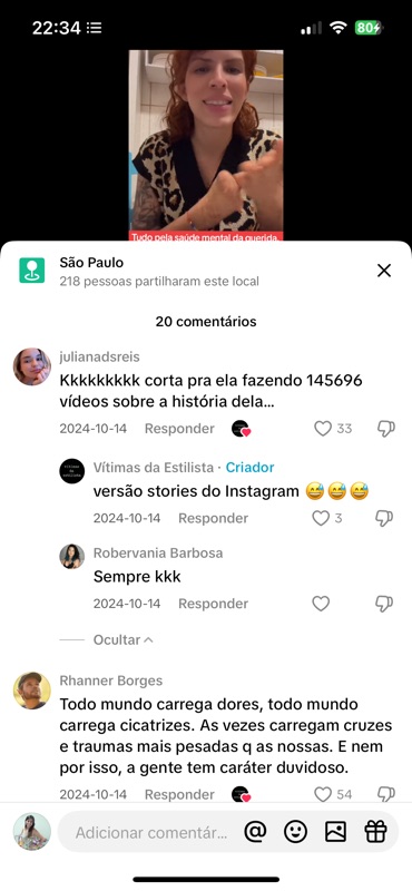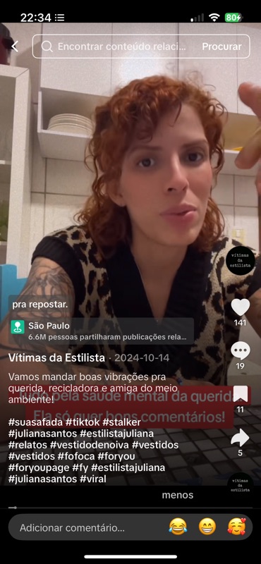 - O vídeo foi repostado com legenda de cunho sarcástico, com a intenção de humilhar a estilista publicamente. Termos como “recicladora”, “querida” e a ironia com sua saúde mental configuram zombaria direcionada.