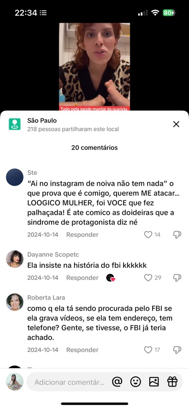 - “Como que ela tá sendo procurada pelo FBI se grava vídeos?” – Insinuação de mentira.
